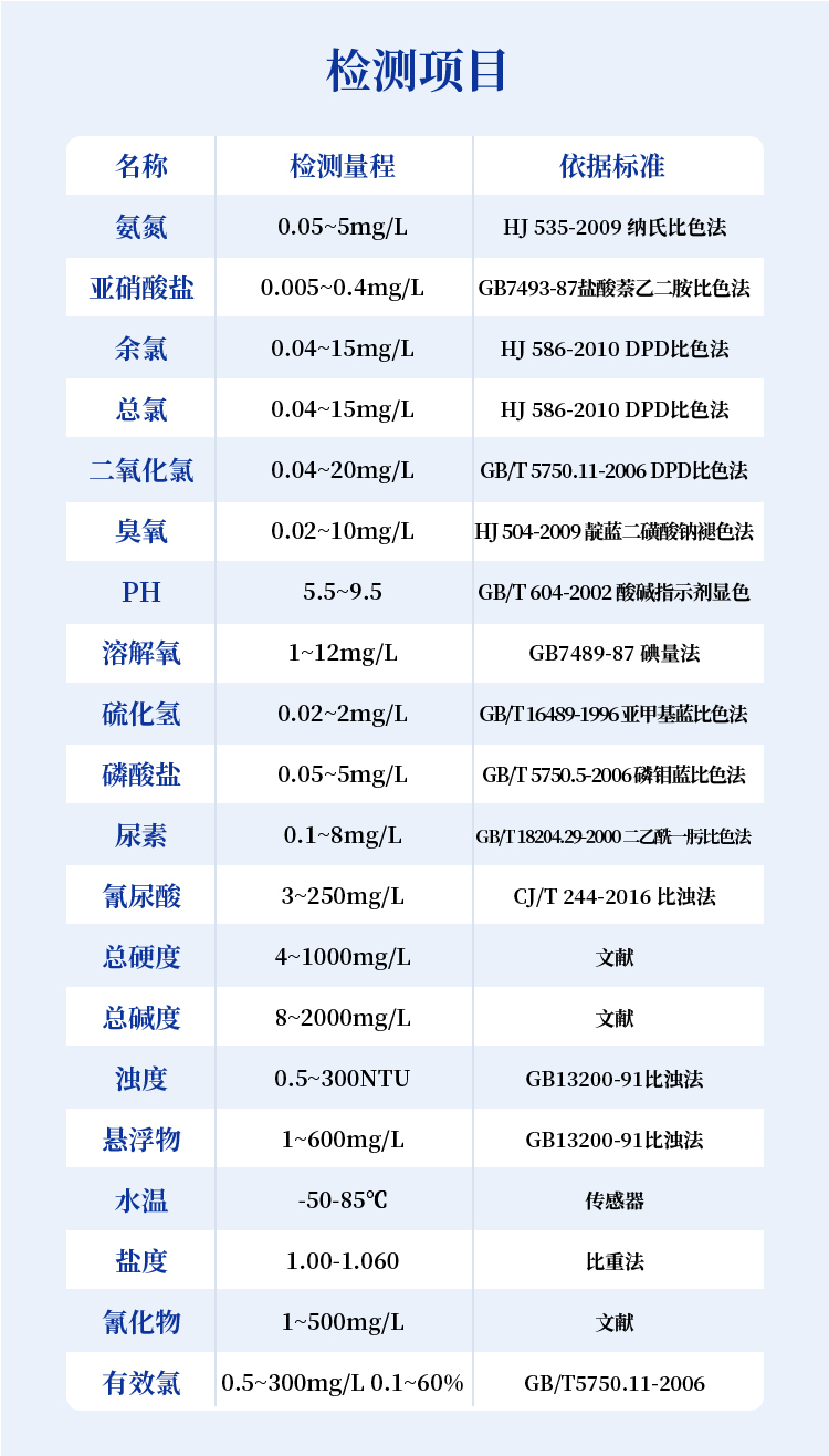 余氯,总氯,二氧化氯,浊度,氨氮,亚硝酸盐,铁,锰等多种检测指标;
