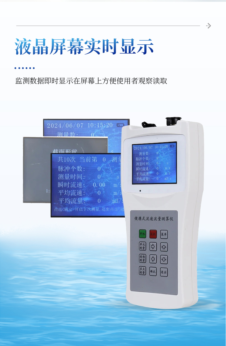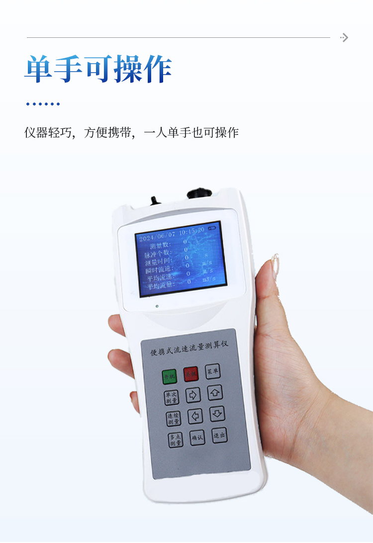 流量测量:输入被测断面类型,并手工输入(或者通过辅助传感器测量)规则断面的水位、宽度计算断面面积,仪表更具Q=V*S测算流速Q值